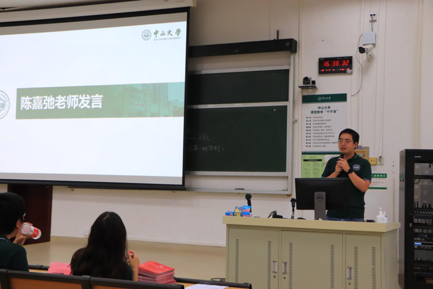 一班班主任助理教授陈嘉弛老师讲述了自己在大学期间的学习和生活经历,以诙谐幽默的语气拉近与学生的距离,同时表达了与本班学生共同成长进步的期待。他认为作为学生应当找准自身定位,要与自己进行比较而不是过度与他人进行比较。